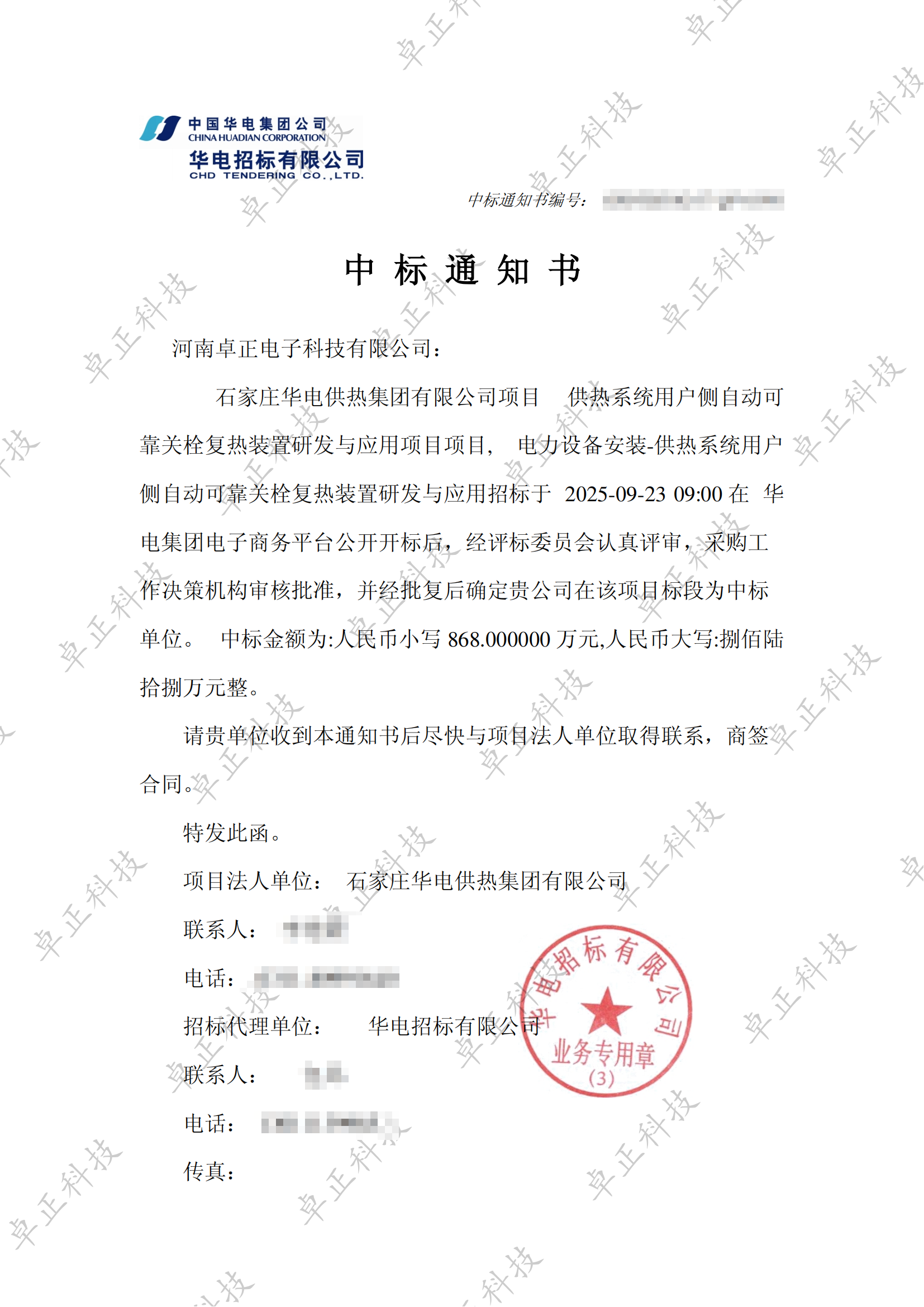 【中標公告】卓正科技中標石家莊華電供熱項目