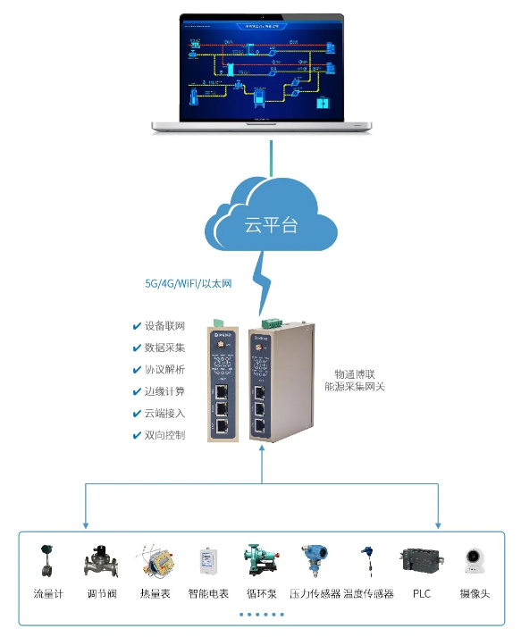 網(wǎng)關(guān)具備多個串口/網(wǎng)口的數(shù)據(jù)采集能力,能夠接入多個流量計、智能電表、熱量表、稱重儀器等設備,實時采集各類能耗數(shù)據(jù)并通過 5G/4G/WIFI/以太網(wǎng)等方式對接到管理平臺中。