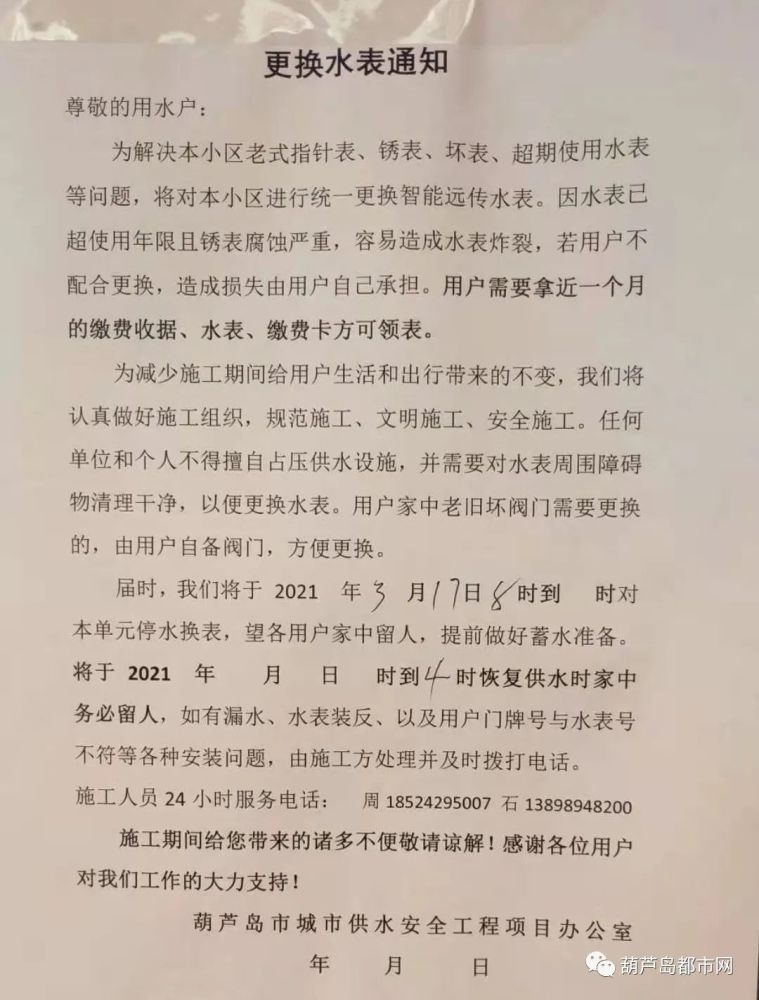 葫蘆島更換水表通知